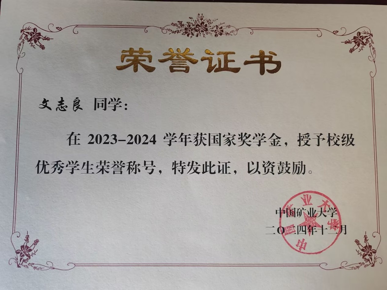 在矿大的教学楼群中,文志良的身影总是与晨光同至。作为同时斩获2024年国家奖学金与2023年国家励志奖学金的"双冠王",这位色碟