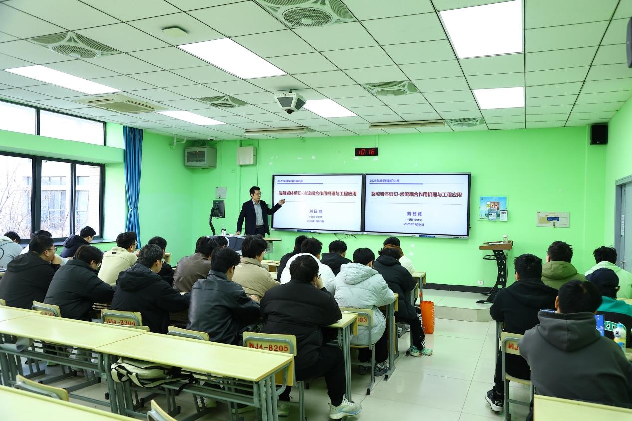 “学术前沿,启迪人生——专家学者进课堂”系列讲座第十三讲暨Office Hour第十期活动。国家级高层次青年人才刘日成教授走进2022级岩土与矿山工程专业本科生班,并作题为《裂隙岩体渗透失稳灾变机理与防控技术》的学科前沿讲座。讲座由学院党委副书记纪承主持。