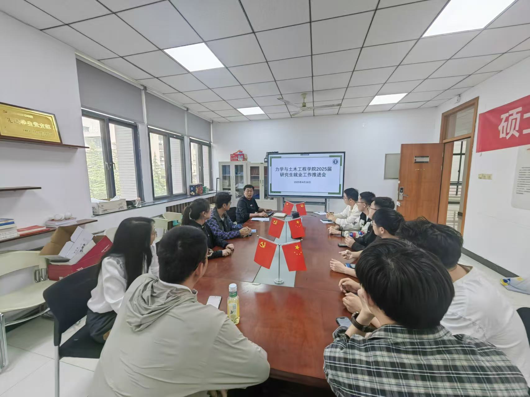 4月16日,在学院楼A203会议室召开2025届研究生就业工作推进会。学院研究生辅导员李亮主持会议,研究生各毕业班级班长参加了会议。会上,李亮向各位班长介绍了当前的就业形势,分析了目前就业工作中存在的困难,就如何帮助同学们积极落实毕业去向与大家进行了交流。结合前期调研和学校相关政策,李亮对同学们在就业信息获取、就业手续办理、就业单位选择等方面的问题进行了解答。李亮还对各班级班长提出了要求,他希望大家勇于承担责任,做班级里的就业先锋,准确摸排同学们的就业情况,积极收集同学们在就业过程中的问题并及时向学院反馈,帮助班级同学落实毕业去向。